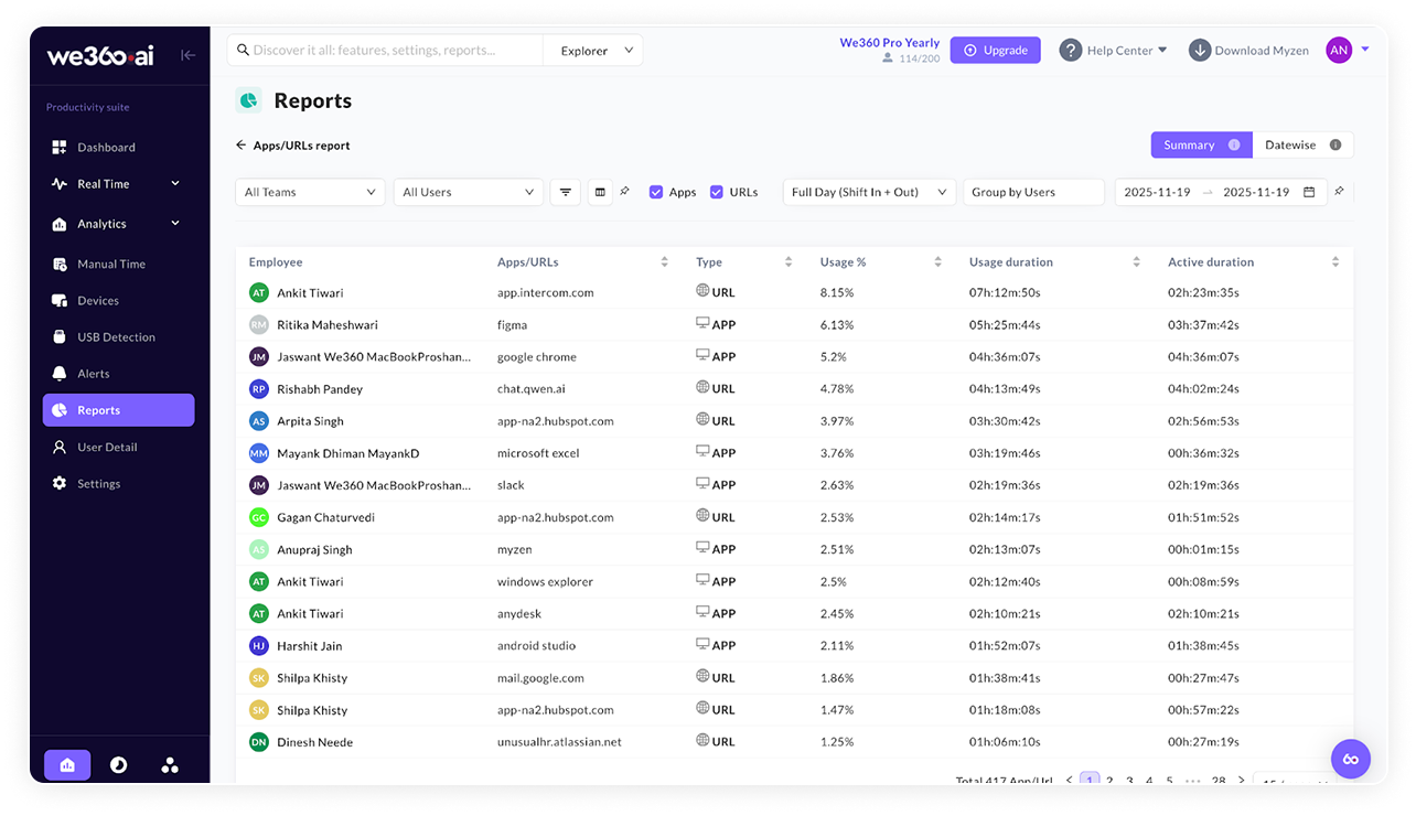 Leverage advanced machine learning to move beyond basic time tracking. We360.ai analyzes behavioral patterns, application usage, and workflows to deliver deep insights into team productivity—empowering leaders to benchmark performance across departments, geographies, and roles.