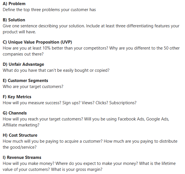 To create a business plan, you can adhere to Lean Canvas. It is a one-page, nine-block business model template focusing on the problem-solution of your business.