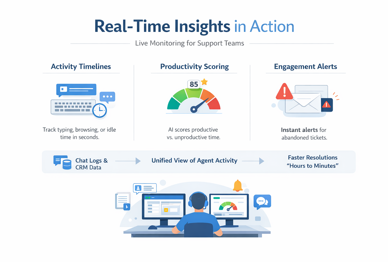 - Activity Timelines: See if an agent is actively typing responses, browsing knowledge bases, or idle—flagging delays within seconds.