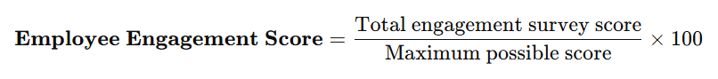 - Employee engagement score : Employee engagement score measures how emotionally committed, motivated, and involved employees are in their work and with the organization. It’s typically calculated using employee survey responses.
