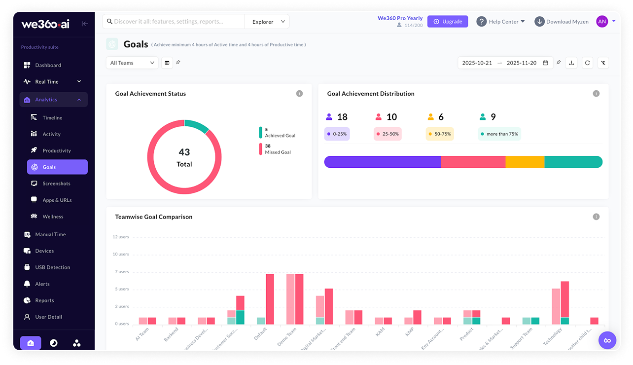 Leverage advanced machine learning to move beyond basic time tracking. We360.ai analyzes behavioral patterns, application usage, and workflows to deliver deep insights into team productivity—empowering leaders to benchmark performance across departments, geographies, and roles.