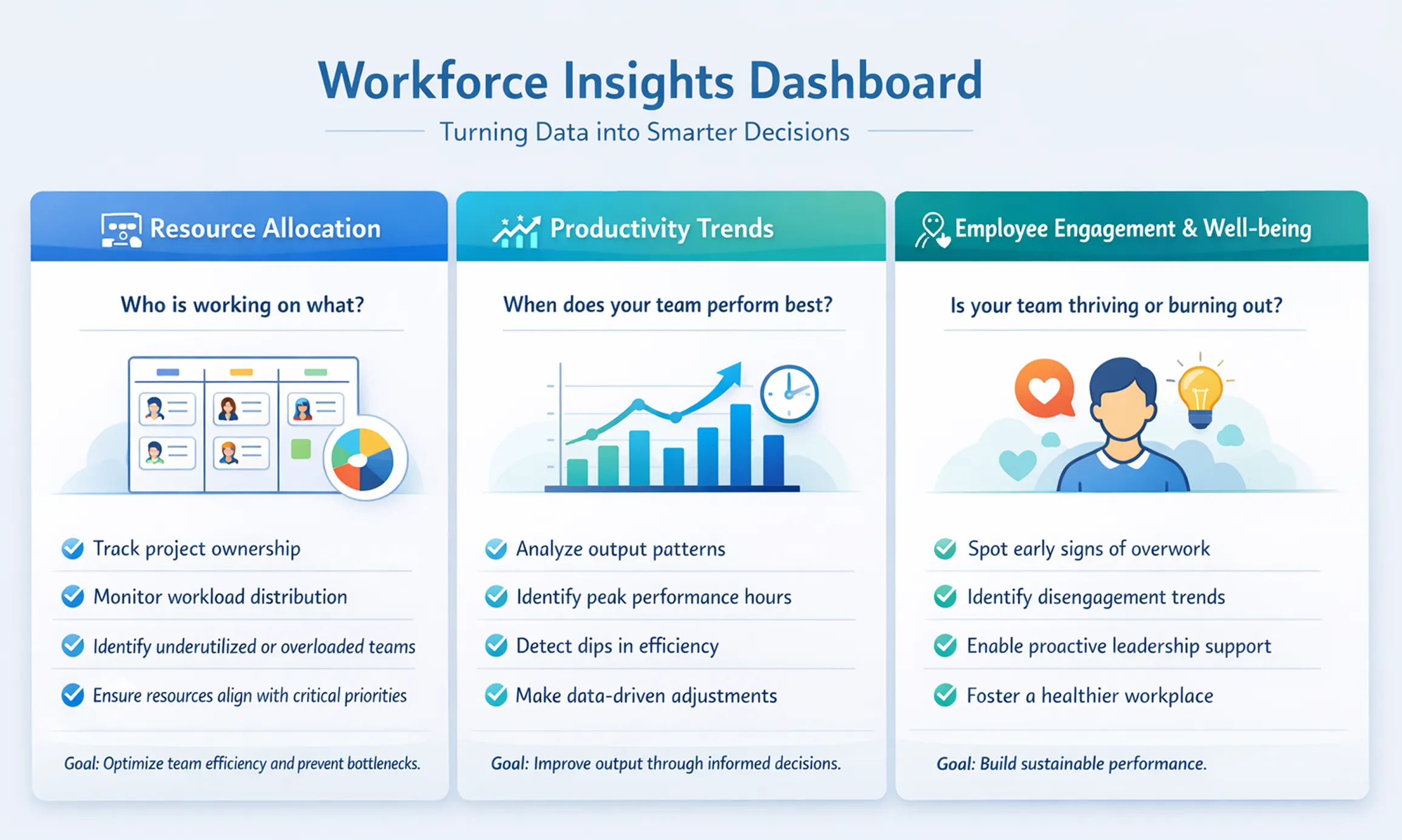 - Employee Engagement & Well-being: Spot early indicators of overwork or disengagement, allowing for proactive intervention and support.