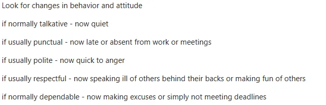 - Isolation: Instead of engaging with peers like earlier the employee starts isolating themselves.