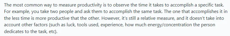 To put it in other words productivity is a ratio between time and resources put into a task and its outcome. To measure productivity you must quantify ‘work done’ and ‘output.’