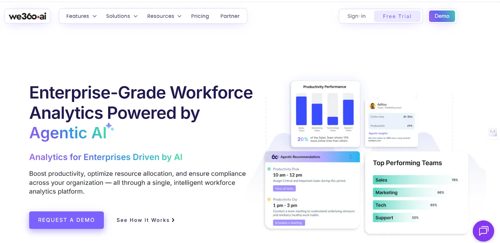We360.ai is an employee productivity monitoring tool providing insight into employee work environment. It gives a bird’s-eye view of employee activity, whether working from office, home or any remote location.