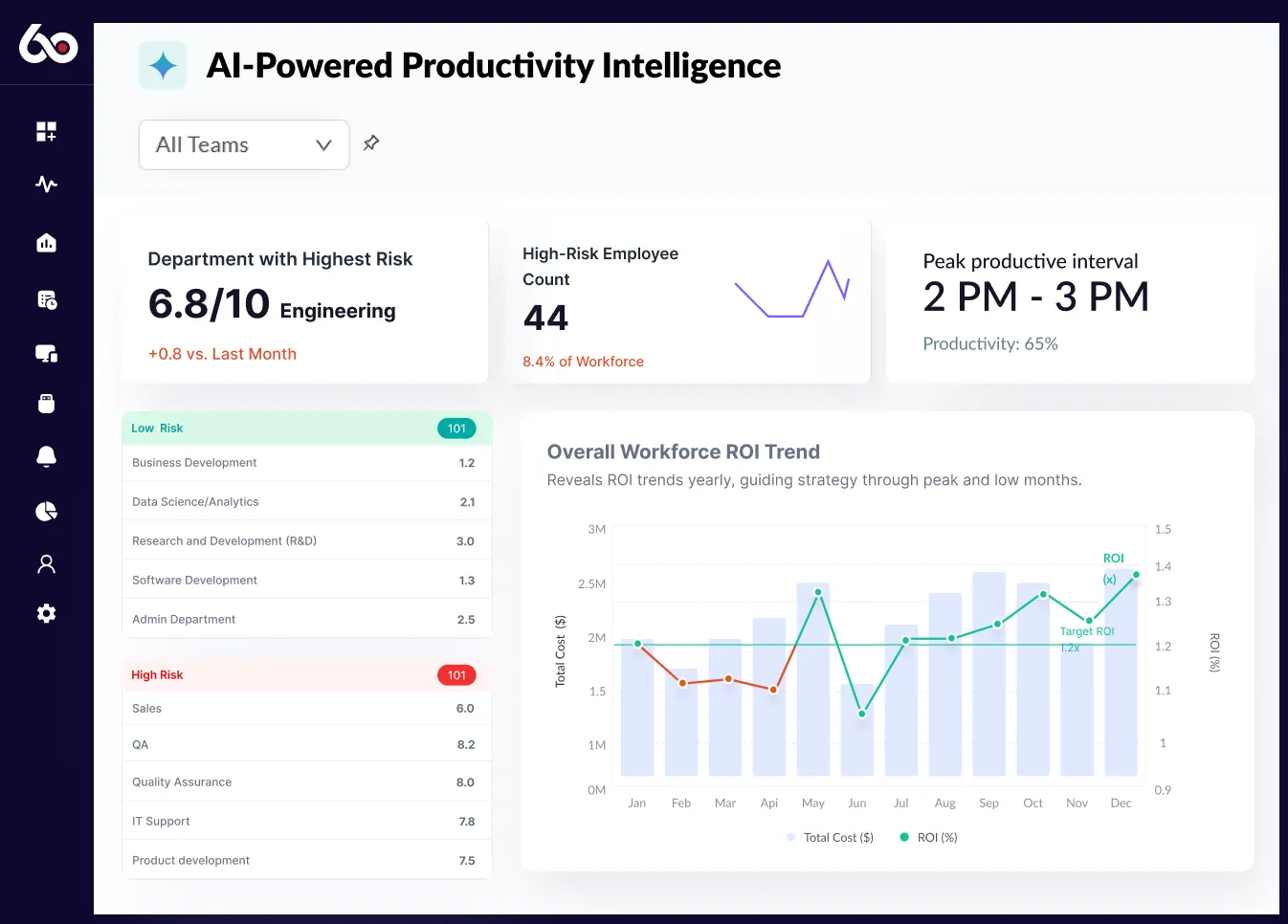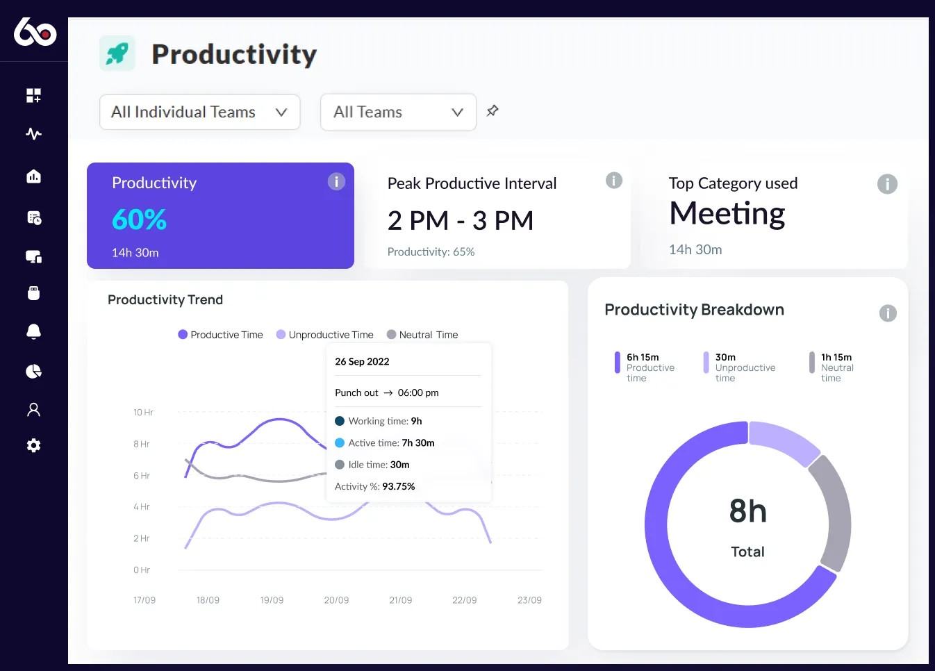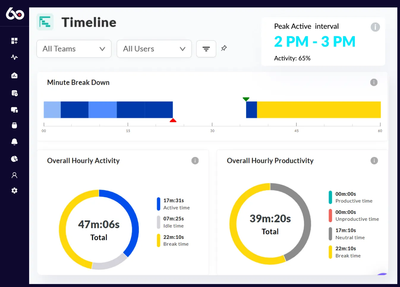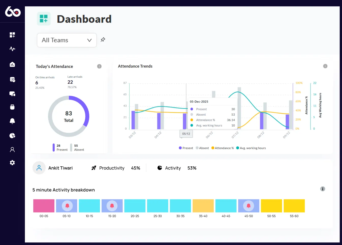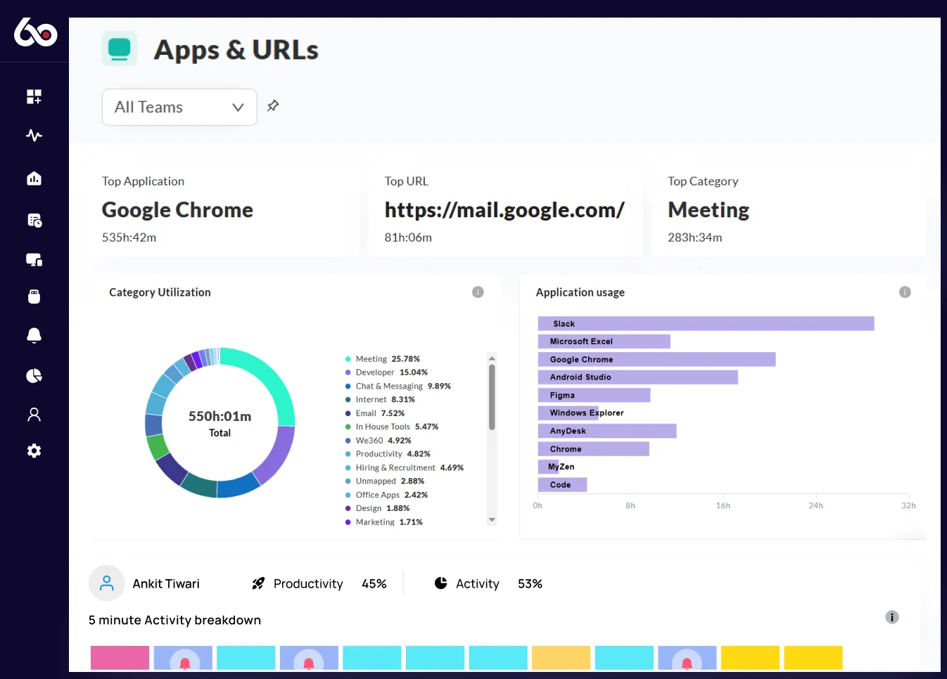 We360.ai employee monitoring software has all the features you need to increase productivity and efficiency, and is available for a free trial. With our free employee monitoring software, you can easily track your team's activity, set goals and targets, and see real-time results.